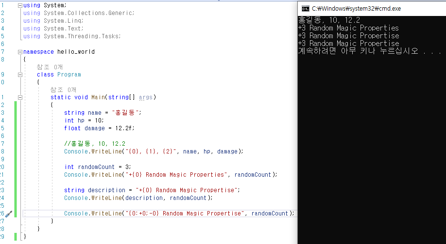 Console.WriteLine(description, magicCount);
