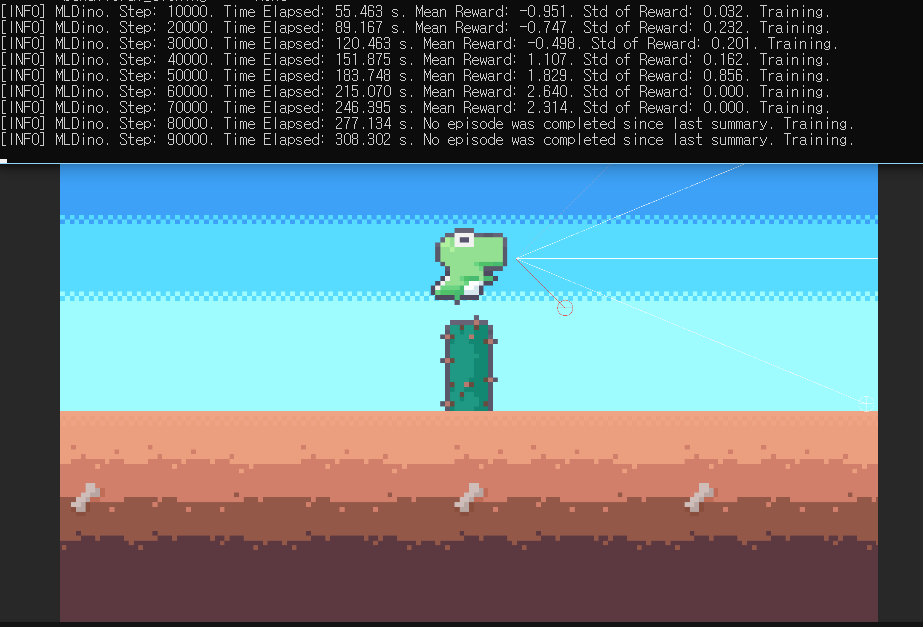 8만번 쯤에서 훈련이 종료된거같지만 시간이 지나면 선인장에 충돌