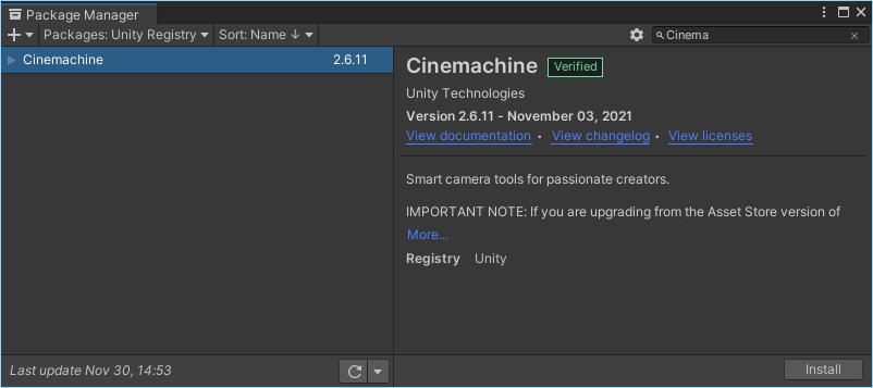 Package Manager에서 Cinemachine 패키지를 설치