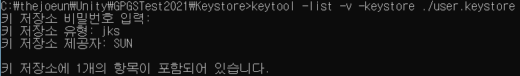 명령 프롬프트에서 keytool -list -v -keystore ./user.keystore 입력시