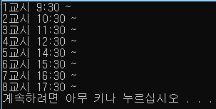 Console.WriteLine("{0}교시 {1}:30 ~", i + 1, i + 9);