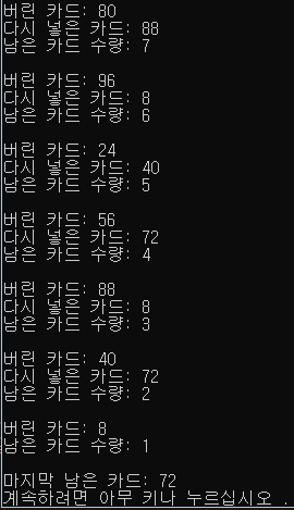 Console.WriteLine("마지막 남은 카드: {0}", queue.Dequeue());